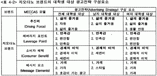 <Ç¥ 4-2>¿¡ Àüü Á¶»ç ´ë»óÀÚÀÇ ¸ÞÄ«½º ±¤°íÀü·« ±¸¼º¿ä¼Ò¸¦ »ìÆìº¼ ¶§, Áö¿À´Ù³ë ºê·£µåÀÇ ±¤°íÀü·«Àº